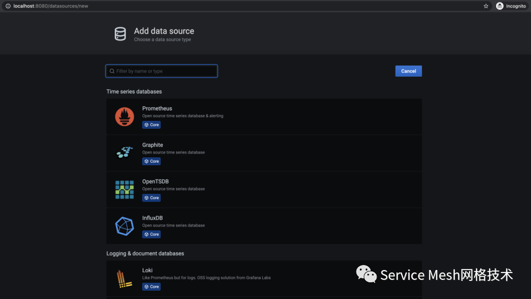 在数据源视图中,点击添加数据源,然后选择 Loki。