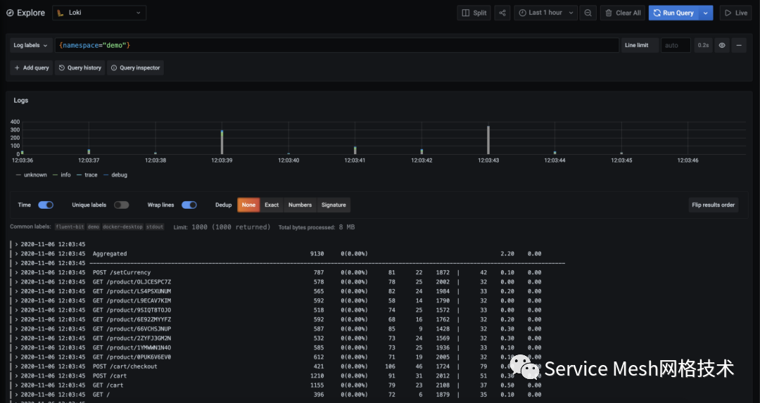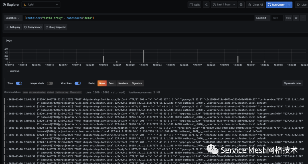 要查看来自 demo 命名空间的 istio-sidecars 的日志,可以使用语句 {container="istio-proxy", namespace="demo"}