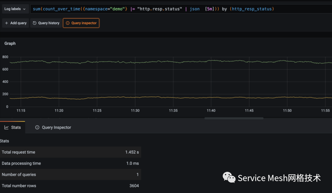 sum(count_over_time({namespace="demo"} |= "http.resp.status" | json [5m])) by (http_resp_status)。