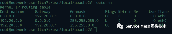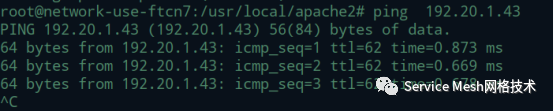 Ping包的dst ip 为192.20.1.43,根据路由匹配到最后一条路由表项,去往192.20.0.0/12的包都转发给192.20.0.1