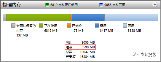 PC有16G的内存,磁盘Cahce占用了3.59G,这是动态的,会自动调整大小