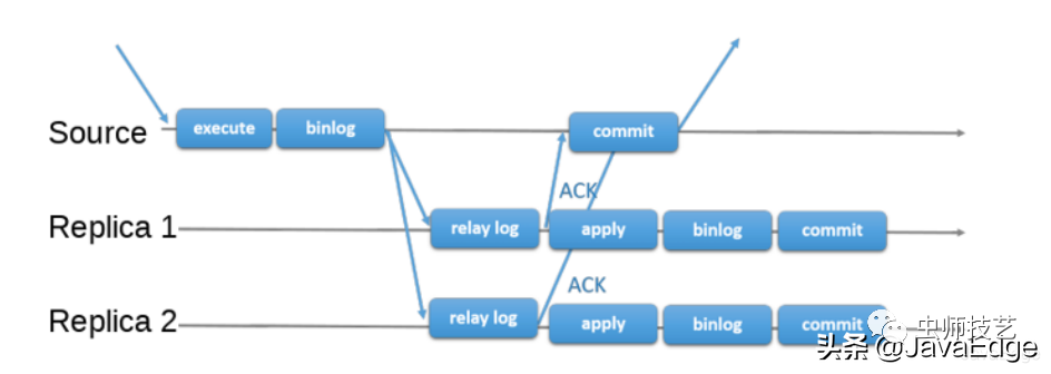 主库将变更写binlog日志,然后从库连接到主库后,从库有个I/O线程,将主库的binlog日志拷贝到本地,写入一个中继日志。接着从库中有一个SQL线程会从中继日志读取binlog,然后执行binlog日志中的内容。即在本地再次执行一遍SQL,确保跟主库的数据相同。