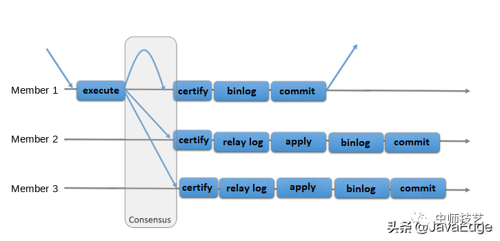 下图描述了MySQL组复制协议,通过将其与MySQL复制(甚至MySQL半同步复制)进行比较,您可以看到一些区别。请注意,为清楚起见,此图中缺少一些基本的共识和Paxos相关的消息。