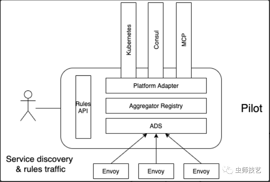 Pilot在架构上,由用户接口层,抽象模型层,平台适配层和面向Envoy的XDS协议层构成。