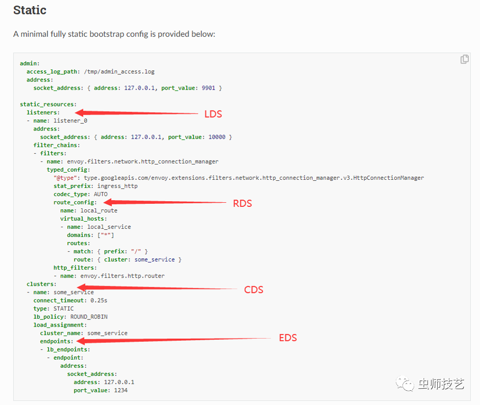Envoy通过文件系统或者查询一个或者多个管理服务器来动态获取配置。总体来说,这些发现服务及相关API被统称为xDS。xDS是一类发现服务的总称,包含LDS、RDS、CDS、EDS及SDS等