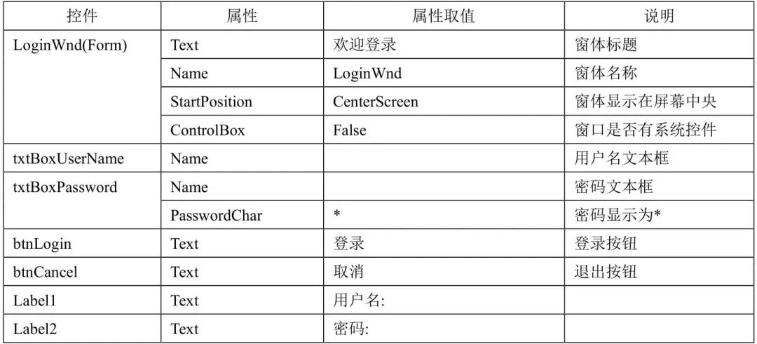 “用户登录”窗体中放置2个文本框(TextBox),用来输入用户名和密码;2个按钮(Button)用来进入和退出系统;3个标签(Label)用来显示窗体的信息。这些控件的属性设置见表4。
