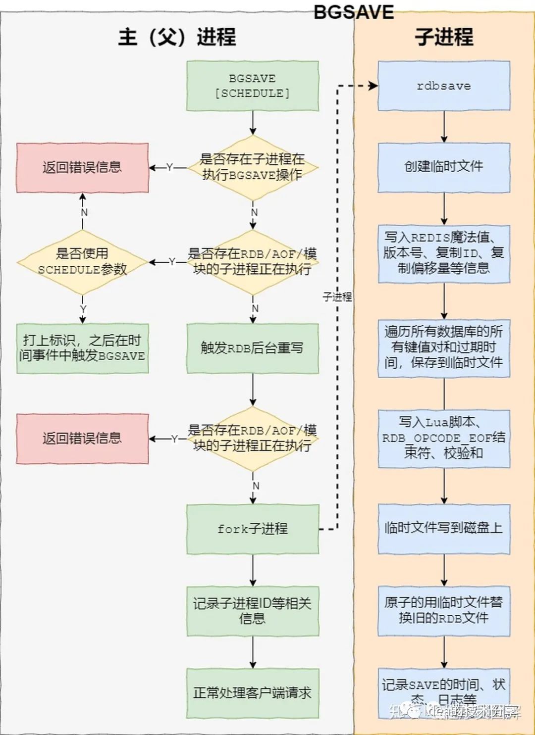 关于Redis在使用RDB方案解决数据持久化的时候实际上底层的主进程是fork了一个子进程用于处理RDB文件,我在网上找到了一份比较清晰的流程图用于展示这个环节中的细节点: