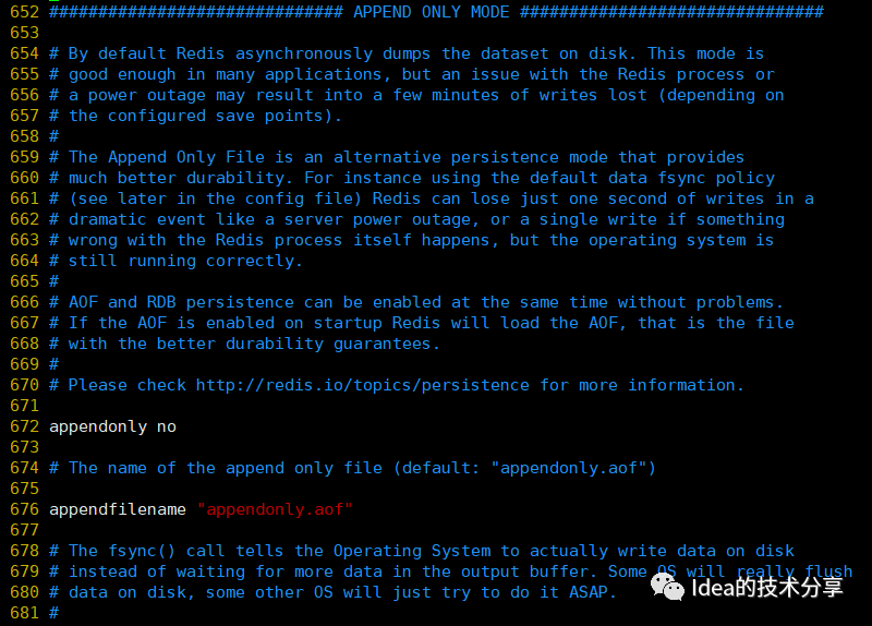 appendonly:默认值为no,也就是说redis 默认使用的是rdb方式持久化,如果想要开启 AOF 持久化方式,需要将 appendonly 修改为 yes。