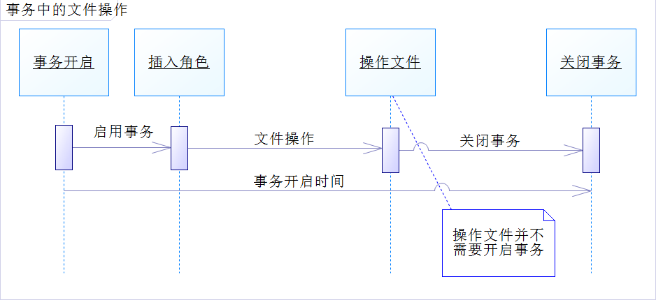 @Autowiredprivate RoleService roleService = null;public Role addRole(Role role) {// 带事务方法roleService.insertRole(role);// 不需事务方法doSomethingForFile();return role;}