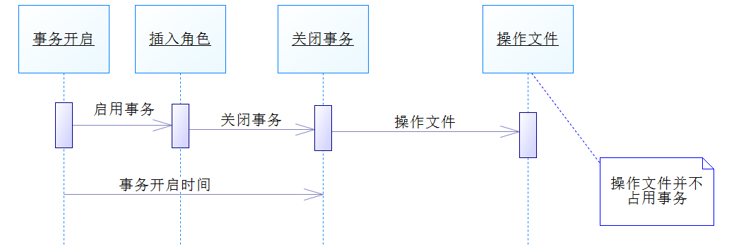 当insertRole方法结束后,Spring才会释放数据库事务资源,也就是说在运行doSomethingForFile方法时,Spring并没有释放数据库事务资源,而等到doSomethingForFile方法运行完成返回result后,才会关闭数据库资源。