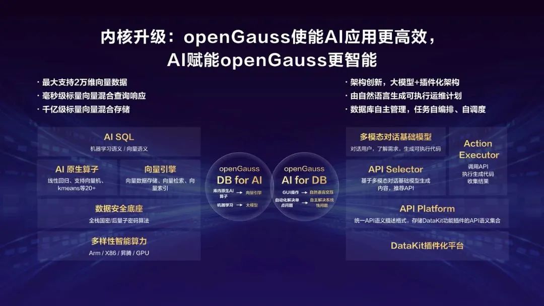 内核方面:DB4AI升级为支持向量引擎,从支持简单的机器学习应用,升级为支持大模型应用;AI4DB将融合大模型和DataKit插件化架构,实现从GUI操作升级到自然语言交互、从自动化解决单点问题进化为自主解决系统性问题。