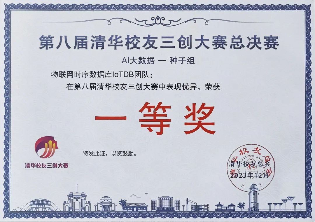 2023 年 12 月 28 日,第八届清华校友三创大赛总颁奖典礼暨项目展示对接会在清华大学举办。活动汇聚 100 多个优质的三创项目,并特邀三创平台"政产学研金服用”各界代表与生态伙伴,以搭建高层次人才、优质创新创业项目与地方政府、产业资源对接的桥梁,更高质量地服务经济社会发展。其中,物联网时序数据库 IoTDB 被授予人工智能与大数据种子组一等奖,并现场进行了涉及产品技术、应用、生态等方向的路演展示。