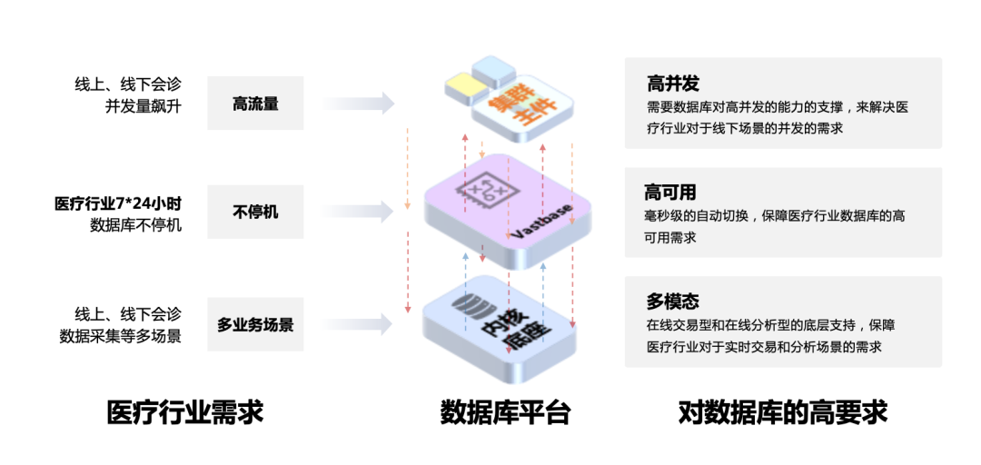 基于以上诉求,经过严格的选型和测试,基于openGauss内核的海量数据库Vastbase有效满足医疗行业高并发、高可用、多模态等对数据库的高要求。