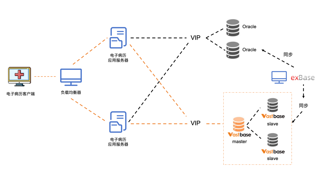 双轨运行方案中,主数据库采用海量数据库Vastbase用于日常的数据增删改查,Oracle为辅库,通过exBase同步软件实时同步主库数据到Oracle中。嘉和美康电子病历v6.1应用服务器端内置智能路由,海量数据库正常运行时,应用服务会将对数据的操作路由到海量数据库,当海量数据库异常时,智能路由会自动将数据操作到Oracle数据库。