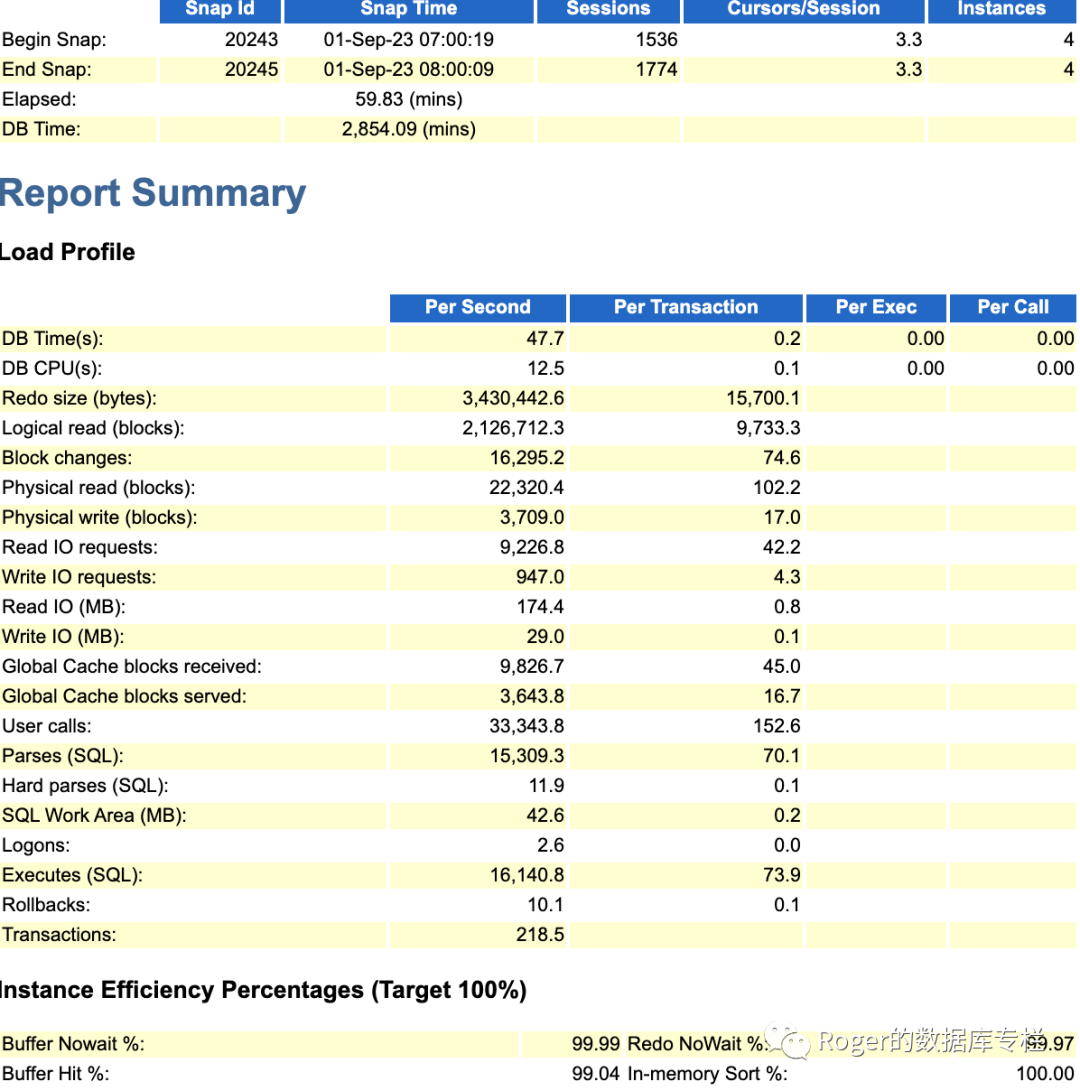我们可以看到这个客户的核心Oracle RAC是4节点集群,单节点高峰SQL每秒执行量是16000左右,每秒逻辑读诗16G左右,此时buffer cache命中率在99%,算是一个比较不错的数据。同时物理读每秒大概是174MB.而该实例的buffer cache实际大小设置是200GB,也就是说每秒的逻辑读大小小于Buffer cache size的1/10;每秒物理读IO 大约是Buffer cache大小0.01%左右。当然这里客户的机器配置相对较高,所以配置相对略大一些,其次是考拉到了4节点集群,如果某些节点出现故障,那么压力会转移到存活节点,此时对硬件资源要求就高一些。