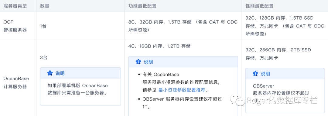 讲完Oracle数据库,我们再来说说其他的国产数据库,比如目前最火的分布式数据库OceanBase,先来看看OceanBase官方文档对于资源的需求说明:
