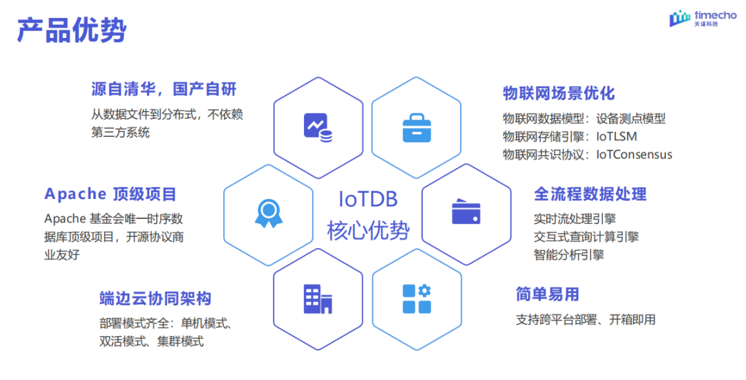 当前,工业领域数字化转型急需将生产过程中产生的时序数据,转换为可管理、可运用的数据资产。而天谋科技团队研发的 IoTDB 正是一款低成本、高可用的物联网原生时序数据库,其自研完整的存储引擎、查询计算引擎、流处理引擎、智能分析引擎,并拓展集群管理、系统监控、可视化控制台等多项配套工具,具有多协议兼容、高压缩比、高通量读写、工业级稳定、极简运维等特点,可实现单平台采存算管用的时序数据管理横向一站式解决方案,与跨平台端边云协同的时序数据管理纵向一站式解决方案。