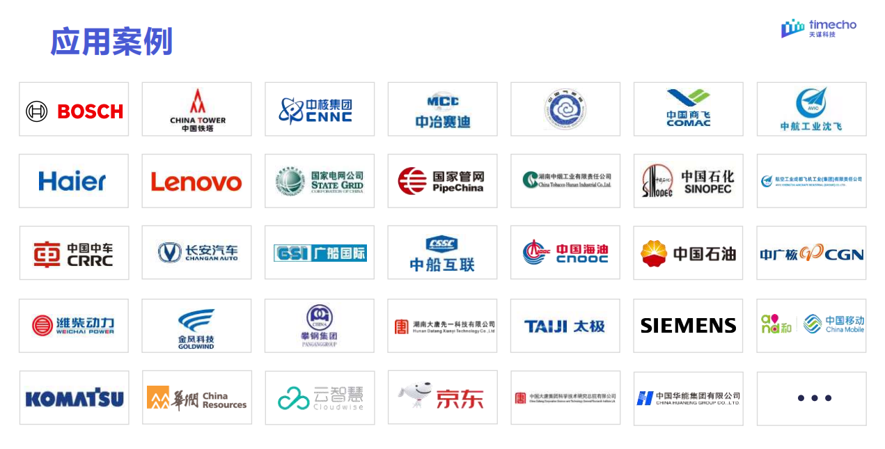 与此同时,天谋科技支撑 IoTDB 实现典型、影响力较高的多方落地实践案例,并提供原厂研发团队全面的运维服务,包括安装培训、顾问咨询、使用指导、实践解析等,以有效降低运维人员工作/学习成本,降低数据库运维成本。目前,IoTDB 覆盖能源电力、钢铁冶炼、航空航天、石油石化、智慧工厂、车联网等工业物联网转型重点行业,已在国家电网、国家气象局、中航成飞、中核集团、中国中车、长安汽车、金风科技等企业广泛应用,并被集成应用于多个国家工业互联网双跨平台,及华为、阿里、海尔、东方国信、用友等工业互联网平台中,协助构建高效时序数据解决方案。