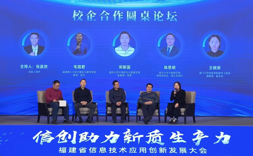 12月27日,福建省信息技术应用创新发展大会,邀请高校专家进行了以“校企合作,助力打造信创新质生产力”为题的圆桌论坛。出席论坛的专家有厦门大学信息学院软件工程系副主任、CCF数据库专委会执行委员王晓黎副教授,复旦大学大数据学院青年研究员、博导陈思明,福州大学计算机与大数据学院硕导邓新国副教授,福建理工大学计算机与数学学院院长毛国君教授。论坛由福建省人工智能学会(数据库领域)理事、企业工作委员会主任张晨然主持。
