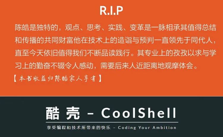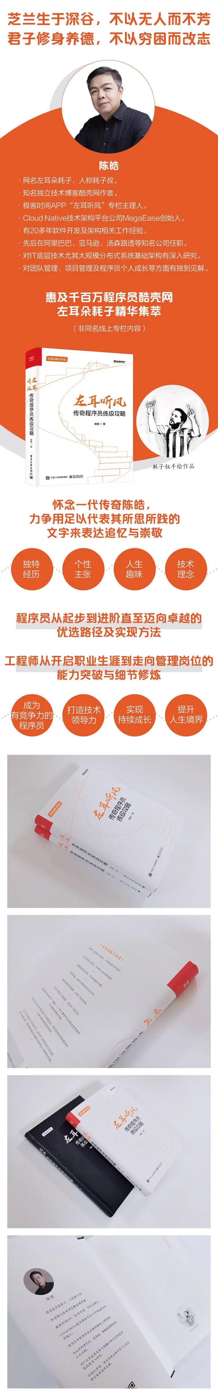 为了怀念一代传奇陈皓,力争用足以代表其所思所践的文字来表达追忆与崇敬,我们将陈皓生前文章精粹整理成《左耳听风:传奇程序员练级攻略》一书!