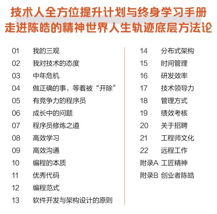 内容包含如何通过理解编程本质和范式、优质代码与架构成为有竞争力的程序员,如何通过注重高效沟通、研发效率、科学管理、合理考核、有效招聘、工程师文化来打造技术领导力,以及如何通过正确面对三观、技术变化、中年危机、他人评价、人生选择、时间管理、有效学习来实现持续成长。