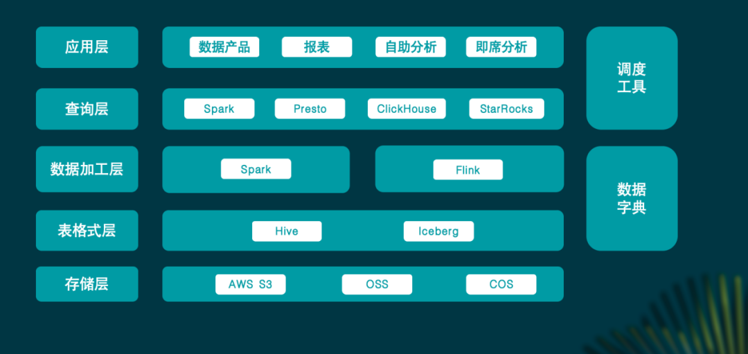 存储层,小红书所有的存储都架构在各家云厂商的对象存储之上; 表格式层,以 Hive 和 Iceberg 为主; 数据加工层,包括离线跟实时两个链路,离线同步链路主要使用 Spark ,实时则主要使用 Flink ; 查询层,目前主要有 4 款查询引擎,在这些引擎的基础上,我们构建了非常丰富的数据产品以及分析产品; 应用层,包括各类实时报表平台、自助分析平台以及一些即席分析平台。