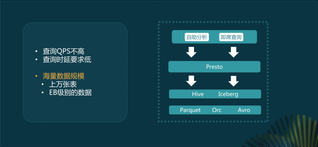 在自助分析场景下,查询的 QPS 以及延迟时间要求会稍微低一些,但是数据规模非常大,底层数据是整个数仓的基础数据,包括上万张表、 EB 级别的数据,如果想把这么多数据都同步到 StarRocks 里明显不现实。在这个场景下,我们之前采用了 Presto 来优化整体的查询性能,Presto 因其在交互式分析以及复杂查询上面的优势,过去几年帮助我们很好地提升了查询性能和用户体验。但是随着小红书自助分析场景需求的不断增长,Presto 已不能满足我们日益增长的降本增效需求。