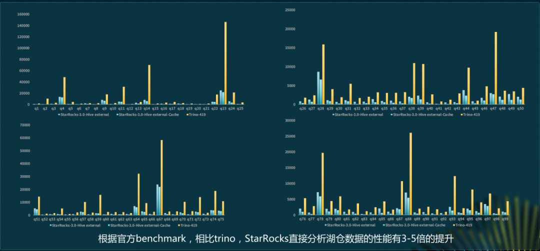 StarRocks 3.0 提出了湖仓分析新范式,在湖上分析能力的增强,给我们带来了曙光。根据官方的一个 benchmark,相比于 Trino, StarRocks 直接分析湖仓数据能够有 3~5 倍的性能提升,因此我们决定从 Presto 迁移到 StarRocks 上。