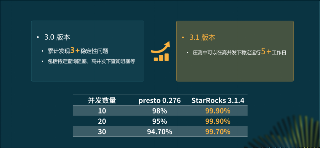 正确性方面,我们整体的验证过程起始于 3.0 版本,收敛于 3.1 版本。在 3.0 版本上,我们在测试过程中遇到过一些问题,但是在跟社区合作过程中,社区非常活跃,及时解决了这些问题,在 3.1 版本基本已不再存在正确性方面的问题了。 在稳定性方面,3.1 版本已经能够达到非常高的稳定性,在我们的高压测试中,可以稳定运行一周以上。我们做了不同并发下的一个压力测试,分别是 10 并发、20 并发以及 30 并发,使用了 StarRocks 3.1.4 和线上稳定的 Presto 版本进行对比。随着查询并发数的增加,StarRocks 在稳定性方面的表现明显优于 Presto。