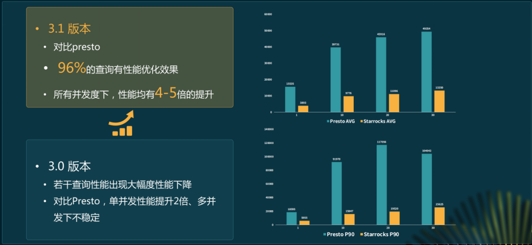 技术架构复杂化,公司内部同时有 Clickhouse、Presto 及 StarRocks 三个核心查询引擎需要维护,大大增加了开发以及运维难度。 Presto 的性能优化困难。 Presto 的主从模式还存在单点故障问题,有潜在的稳定性风险。