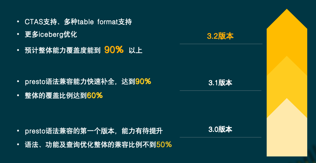 目前我们线上稳定版本已经升级到 3.2 ,该版本不仅提供了 CTAS 语法的支持,并通过 JNI 接口帮助我们去扩展更多的 table format,以及还有很多 Iceberg 相关兼容性优化。基于这些优化,我们的整体覆盖度已经提高到 85% 左右,我们还在持续扩展部分自定义功能,预计整体覆盖度可以提升到 90% 以上,达到新的里程碑。