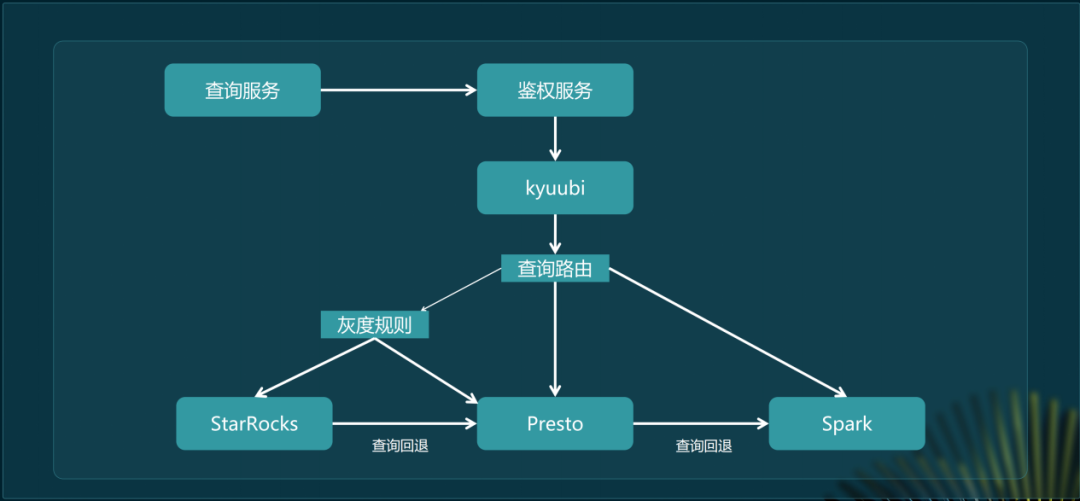 如图所示是引入 StarRocks 之前小红书自助分析的整体架构,在这里面的 Kyuubi 是具有分布式以及多租户特性的网关服务,也是我们查询服务 SQL 查询的入口。在 Kyuubi 上我们也做了深度定制化开发,在这个场景中,用到的核心功能是查询的路由功能和灰度功能。查询路由功能就是 Kyuubi 在接收到用户的查询之后,会根据用户查询的语法特性以及负载情况,将其动态路由到合适的计算引擎进行查询。