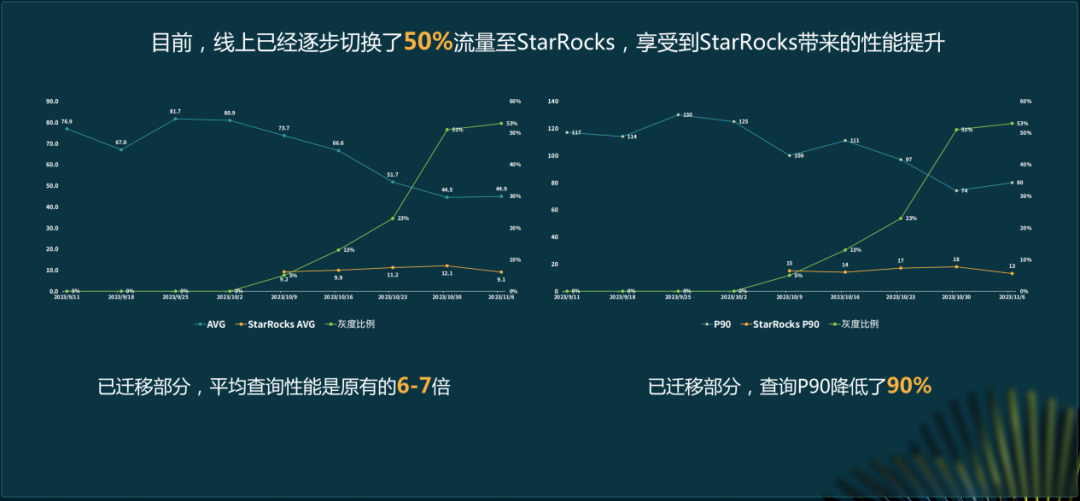 在整个灰度调整过程中,我们会进行持续的正确性验证,利用每天闲时,也就是集群使用量较低的低峰期时间段,对 StarRocks 上的查询结果跟 Presto 查询结果进行动态比对。只有当天的查询性能、稳定性以及正确性都满足目标时,我们才会进一步增加动态灰度比例。这样的灰度调整大概持续了一个月,StarRocks 的灰度比例从 0% 提升到了100%,在这个过程中,我们切实享受到了 StarRocks 带来的性能提升效果。就已经迁移的部分而言,整体的平均查询性能提升了 6~7 倍,查询的 p90 降低了 90%,对于用户来说,查询体验得到了非常大的优化。并且我们整个迁移过程非常平稳,没有出现任何事故,也没有遇到用户吐槽。
