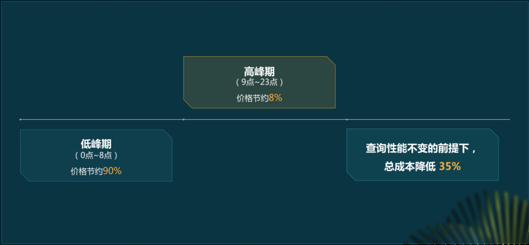 目前我们采取的还是一种在固定时间进行弹性扩展的方式。比如现在定义的低峰期就是 00:00~8:00,高峰期是 9:00~23:00。高峰期机器比较抢手,竞价价格会比较高,我们也不希望我们的机器经常被其他用户所抢占,因此高峰期的成本基本持平。在低峰期我们可以将 90% 的 CN 机器全部还掉,这能够节约大量的成本。总体而言,在目前查询性能不变的前提下,总体的成本能够降低 35%。