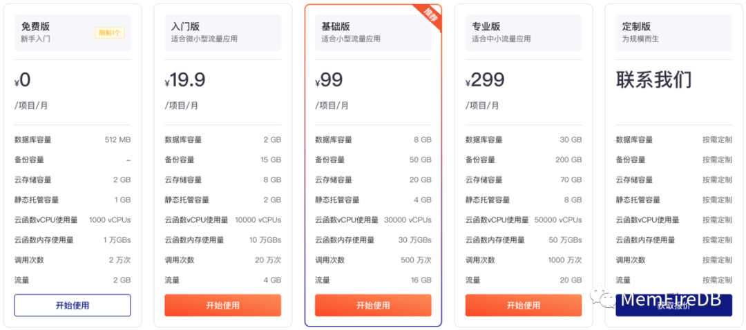 MemFire Cloud提供了针对不同应用开发阶段的专属优惠套餐,包括免费版、入门版、基础版、专业版和定制版,涵盖流量、容量和调用次数等多个维度,以满足您的各种业务需求。