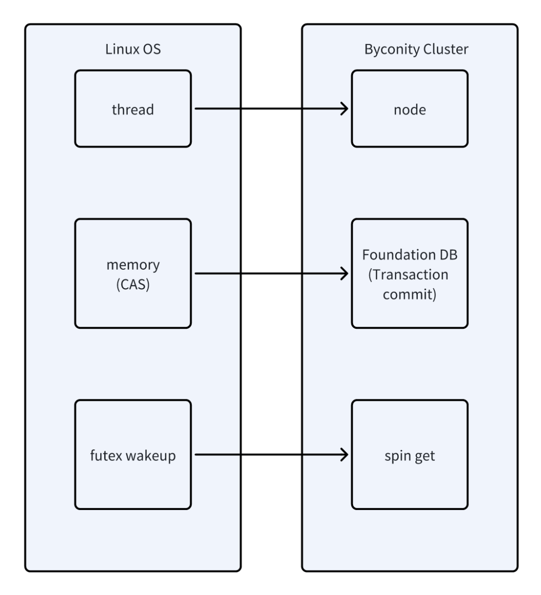 如果我们把 ByConity 多个试图选主的节点看成不同的线程,把支持事务提交、可见性顺序等于事务提交顺序的 Foudation DB(用于存储 ByConity 元数据的高可用 KV 存储,以下简称为“FDB”)看成支持 CAS 写入、保证可见性顺序的本地内存,用节点的定期 Get 轮询去模拟 Linux 内核的线程唤醒通知机制,我们就可以用 ByConity 所使用的高可用 Foudation DB KV 存储,通过模拟 CAS 操作去同步多个节点之间对“谁是 leader”这个问题答案的竞争:谁 CAS 成功谁就是 leader。
