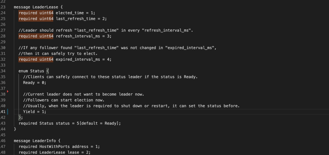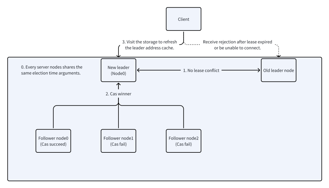 所以如上图,对于 leader CAS 写入的数据结构 LeaderInfo,除了包括自己的监听地址 address,也需要包括关于绑定了时间相关的状态信息 lease:例如 leader 上任时间点 elected_time,最近一次刷新时间 last_refresh_time(有变化就证明自己还活着),刷新的时间间隔要求 refresh_interval_ms,多长时间不刷新就认为 leader 已经任期结束(其它节点可以开始重新竞争 leader 了)expired_interval_ms,以及 leader 的状态 status。
