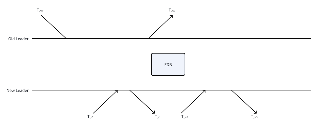 2.如果 follower 和 leader 的时钟在 expired_interval_ms 时间内的走时差异小于 (T_r1-T_w0)+(T_w3-T_w2),那么不会发生 2 任 leader 所在的业务各自认定自己的服务任期 实际有相互交叠的问题:这是因为业务感知到的任期开始需要等待 FDB 写入完成,新 leader 的实际上任时间需要从 T_w3 而不是 T_w2 开始计算(T_w2 仅用于计算超时时刻)。
