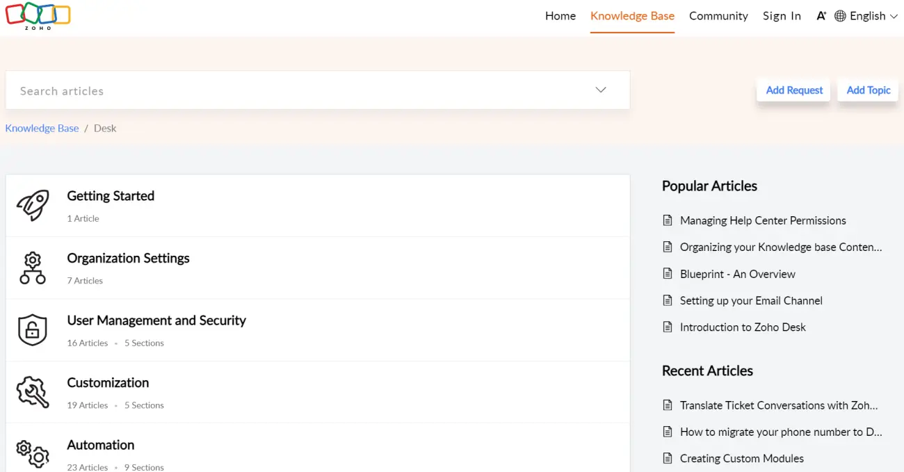 Zoho Desk 是一款多功能的客户支持工具,与200多个热门应用程序无缝集成。它作为一个全面的软件平台,用于知识库,提供了一系列功能来增强客户支持。通过可定制的模板、多语言支持、高级搜索功能和分析报告,企业可以通过他们的知识库提供优秀的客户服务。Zoho Desk 赋予企业优化客户支持操作、提供卓越支持体验的能力。