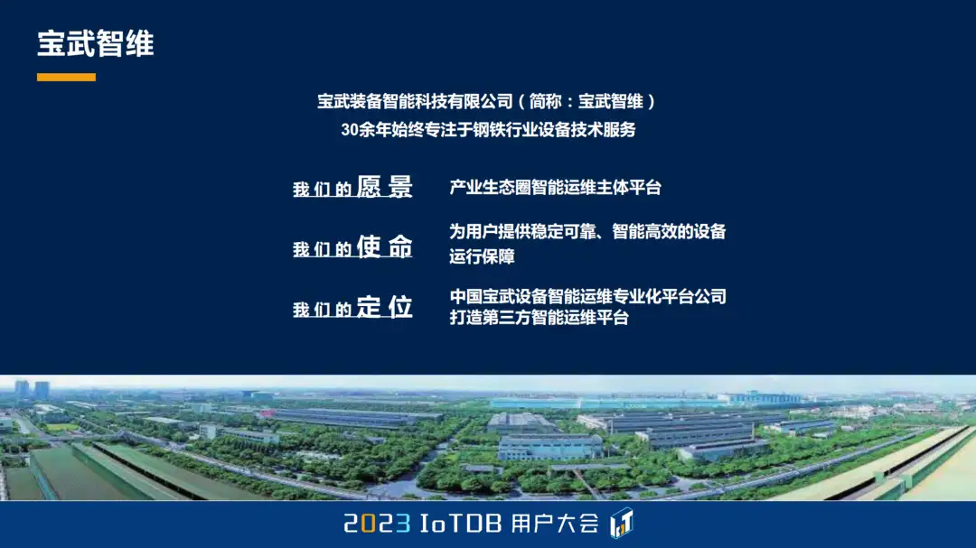 大家好,今天我分享的题目是宝武集团在设备智能运维超大规模分布式数据湖建设的一个探索。我们公司和 IoTDB,实际上应该是在去年的时候,我们也是进行了一次全面的技术的对比,然后在 2023 年是全面的一个融合。