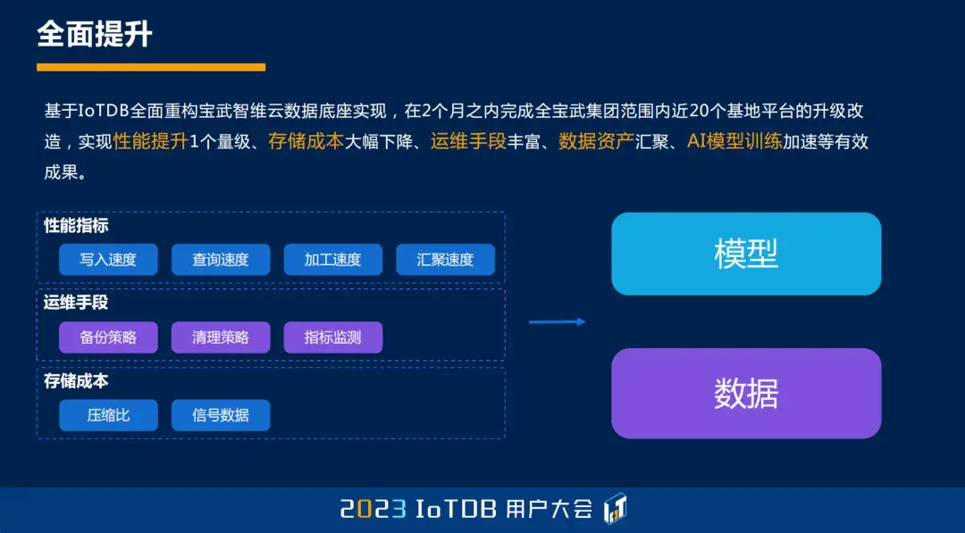 应该说在今年下半年,大概是从 7 月份还是 8 月份开始,我们是在两个月之内就完成了我们全宝武集团,接近 20 个基地数据底座的替换,直接就全部换 IoTDB 了。我们这个效果还是非常明显,我们把它总结了几个词:性能提升了 1 个量级、存储成本大幅地下降、运维的手段丰富了、数据的资产汇聚了、AI 模型训练加速,这些是有效的一些成果。