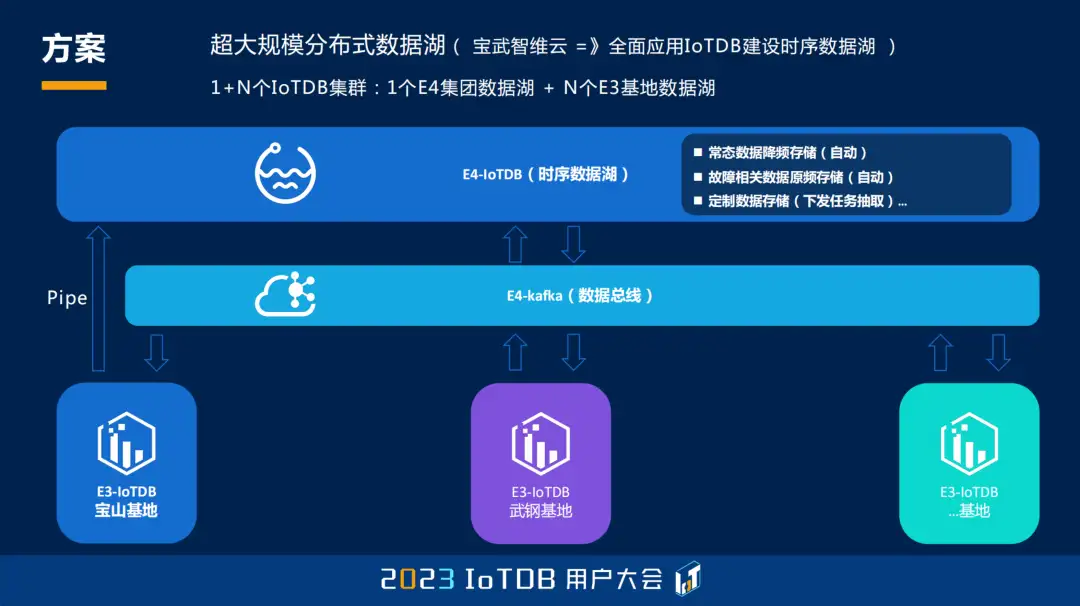 我们首先是全面地应用 IoTDB,替换掉 OpenTSDB 来做时序数据湖。这个其实代表了我们整体目前的一个架构,我们现在全宝武集团所有生产基地,大概我们还有一个基地没实施,马钢现在还没做,其他所有基地,我们的数据底层都换成了 IoTDB。然后,我们在整个宝武集团层,建了 E4 的一个大的数据湖。我们在集团层基本上是常态数据,是降频送上去的,还有就是所有的故障特征数据,是原始频率送上去的,这里面有我们所有的故障特征库。同时在集团层,它可以通过下发任务的方式,去各个基地抽取它所需要的一些数据,主要是用于一些模型团队,还有一些定制化的任务。