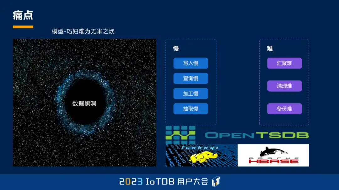 还有一个是加工慢。基于 OpenTSDB,要做各种各样的数据加工,包括聚合函数,这个里面的速度也是非常的慢,而且很容易导致整个数据架构的不稳定。