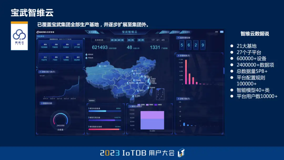 这是我们的一个拳头产品,我们把它叫宝武智维云。目前,宝武集团大概有接近 20 家的生产基地,已经全面覆盖了,就是它在我们每个基地都会部署一个设备智能运维的平台,负责将基地内的所有设备来接入其中,进行在线状态监测和一些智能运维业务。这个图中我们可以看出,我们是目前已经覆盖了 21 大基地,部署了有 27 个子平台,接入了 60 万以上的设备、240 万的数据项,总数据量超过了 5 个 PB。在平台上我们部署的这种具体规则超过 10 万条,我们现在已经沉淀下来的这种智能模型超过 40 大类,平台用户数超过了 1 万。