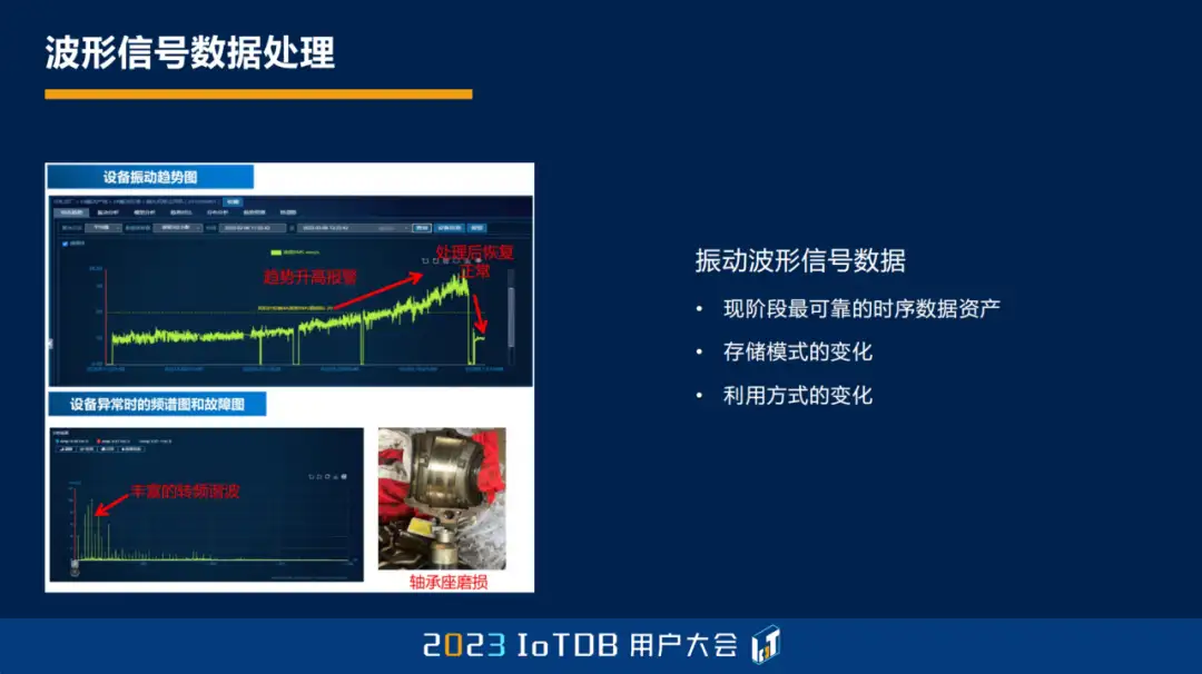 那么我们在这个 IoTDB 引入之后,其实这是一个 IoTDB 公司(天谋科技)技术人员给我们提了一个建议,我们实践下来感觉是非常好的,就是把这个振动数据不再当对象进行存储,而是直接把它拆散之后,用纳秒级的方式以后,存到我们的 IoTDB 去。存进去之后,存储模式发生变化之后,我们的应用模式也发生变化。我们可以直接在 IoTDB 层面上对这些波形数据进行它的处理,这个我们认为是非常颠覆性的一个设计。在我们的很多应用场景里面,一个是压缩比很高,另外一个,真正的把数据当成时序数据来进行管理,可以做很多的一些数据加工。