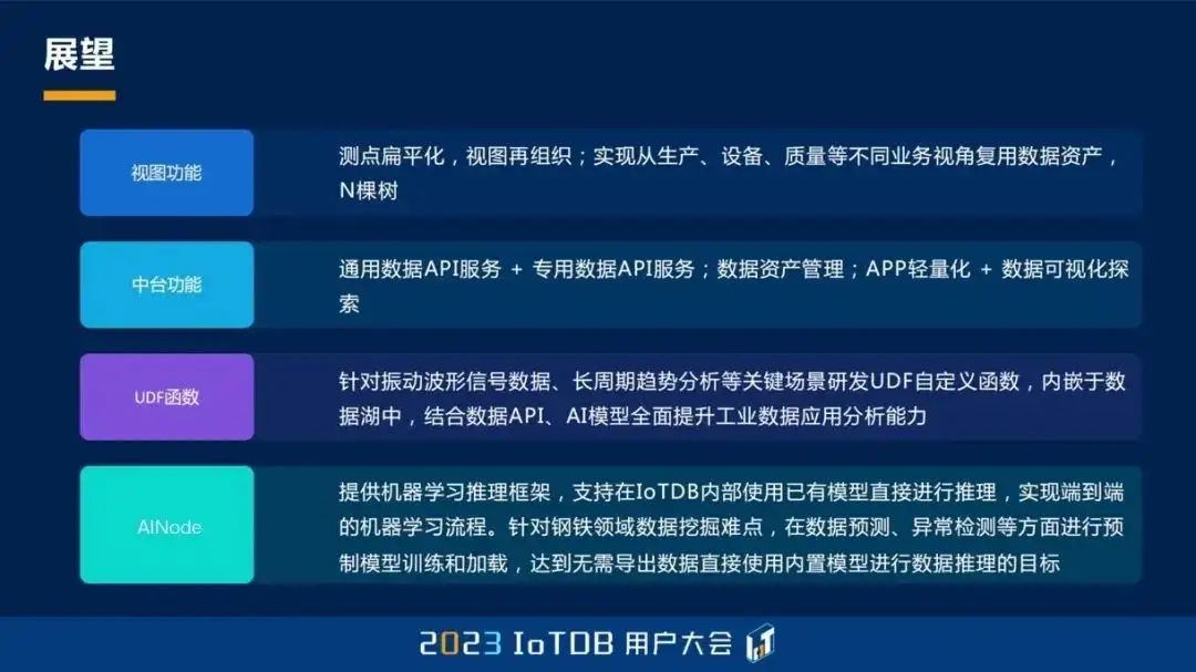 还有一个是 UDF 函数。因为我们目前,IoTDB 在宝武里面还只是将数据底座部署完成,包括查询性能、写入性能、抽取性能都很好,UDF 函数其实我们还没有真正大规模地应用,我们计划明年要用,为什么呢?其实在宝武,我们有沉淀了很多的算法,比如光振动波形,我们就归纳了有 6 大类、将近 35 种振动波形的算法,原来通通都是外挂的 Python 程序,需要诊断分析时去外部调用的。那么我们看了看 UDF,我们计划明年就是针对于振动波形、信号数据、长周期的趋势分析等关键场景,要研发这个 UDF 自定义函数,内嵌到我们的数据湖当中。结合着数据 API、AI 模型,全面提升我们工业数据的应用分析能力。