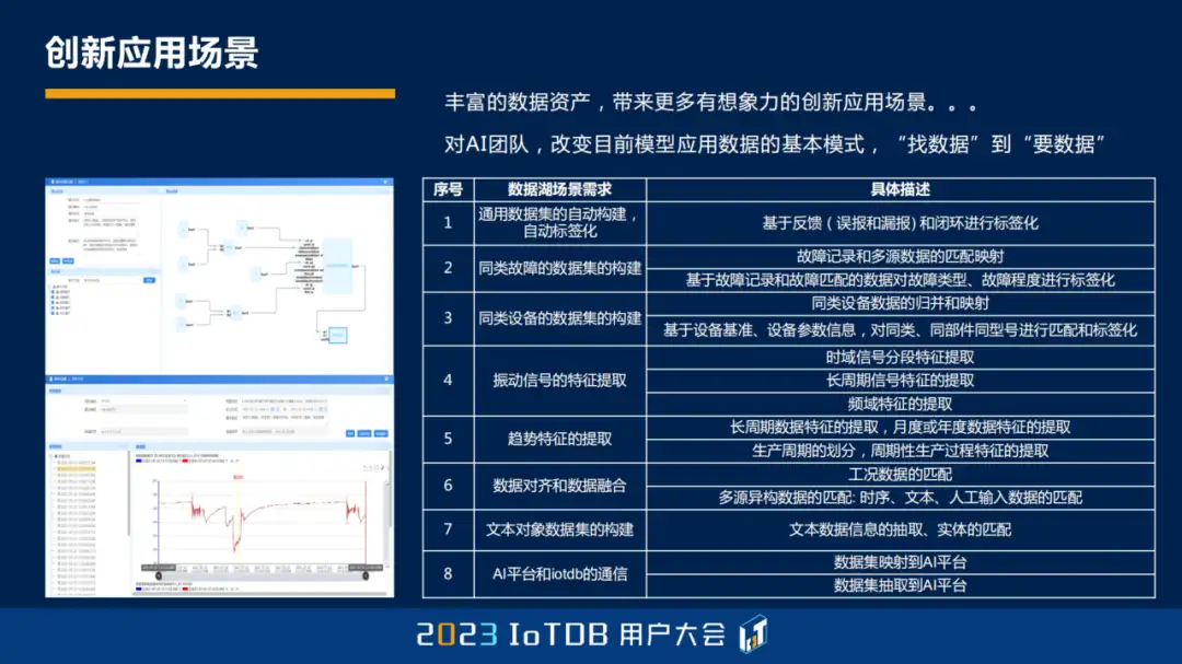 还有些创新应用场景。刚才讲的,数据有了之后,我们大量抽取上传之后,我们的 AI 团队从找数据,现在是要数据了。数据有了之后,我们列了一些数据湖的场景,我们正在做的,包括一些通用数据集的自动构建,自动标签化;包括基于同类故障的数据集的构建;同类设备的数据集的构建;振动信号的特征提取;趋势特征的提取;数据对齐和数据融合;还有文本对象数据集的构建;还有我们有个 AI 平台,和我们 IoTDB 的一个双向通讯。这些时间所限,我不细讲了,但这些就是说有了这么一个流畅的数据湖之后,那么我们在数据的应用上面才有一个更大的发展空间。