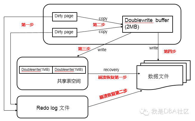 这样就可以解决上文提到的部分写失效的问题,因为在磁盘共享表空间中已有数据页副本拷贝,如果数据库在页写入数据文件的过程中宕机,在实例恢复时,可以从共享表空间中找到该页副本,将其拷贝覆盖原有的数据页,再应用重做日志即可。
