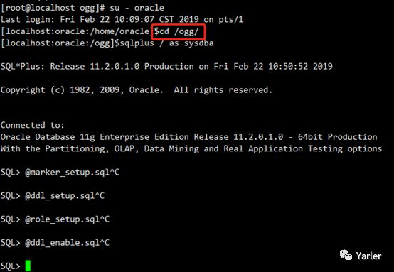 su - oracle cd /ogg sqlplus / as sysdba @marker_setup.sql @ddl_setup.sql @role_setup.sql @ddl_enable.sql |