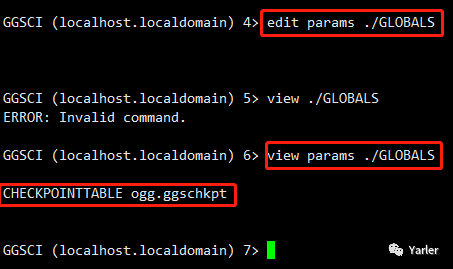 edit params ./GLOBALS //编辑 添加 CHECKPOINTTABLE ogg.ggschkpt 保存退出 view params ./GLOBALS //查看 DBLOGIN USERID ogg, PASSWORD ogg //登入ogg管理用户 ADD CHECKPOINTTABLE //初始化检查表 |